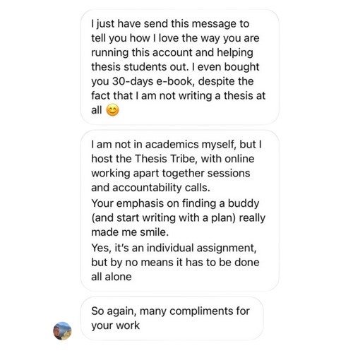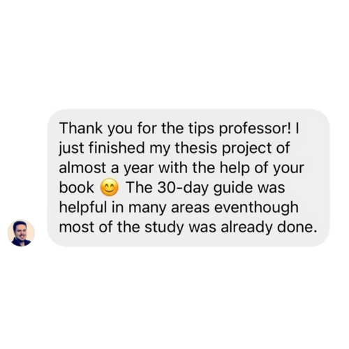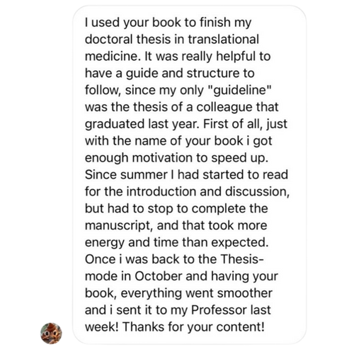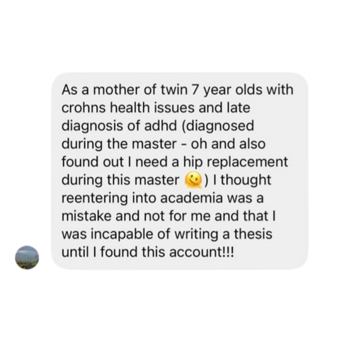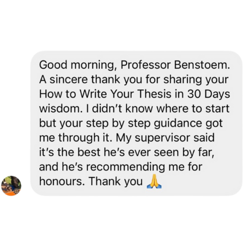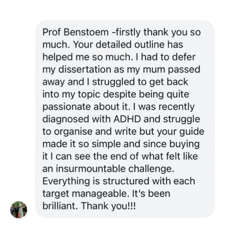 Prof Benstoem -firstly thank you so much. Your detailed outline has helped me so much. I had to defer my dissertation as my mum passed away and I struggled to get back into my topic despite being quite passionate about it. I was recently diagnosed with ADHD and struggle to organise and write but your guide made it so simple and since buying it I can see the end of what felt like an insurmountable challenge. Everything is structured with each target manageable. It's been brilliant. Thank you!!!