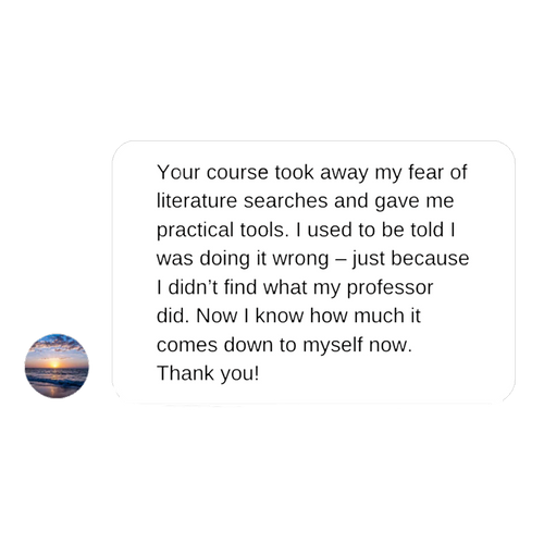 Your course took away my fear of literature searches and gave me practical tools. I used to be told I was doing it wrong - just because I didn't find what my professor did. Now I know how much it comes down to myself now. Thank you!